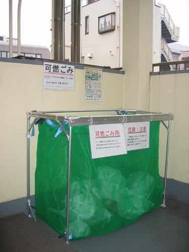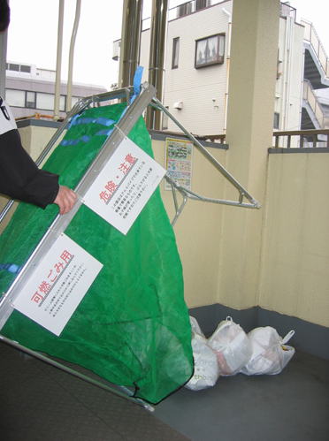![]() 枠ごとネットをどけると、ゴミ袋が残ります。 天井部だけはずせるようにも出来ます。 新宿マンションの廊下 |