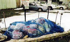 | 3.カラス対策は大量の重りから、 カァー・ラスネット、カバン型へ これはなかなか良く考えられていて、素材も丈夫だしすばらしい!!と絶賛でした。 松山市の実施例 |