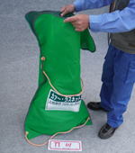 カバン型はデパートでくれる紙袋のような形をした、大きな袋です。 口にアルミのパイプが通っていて、カバンのように下げられます。